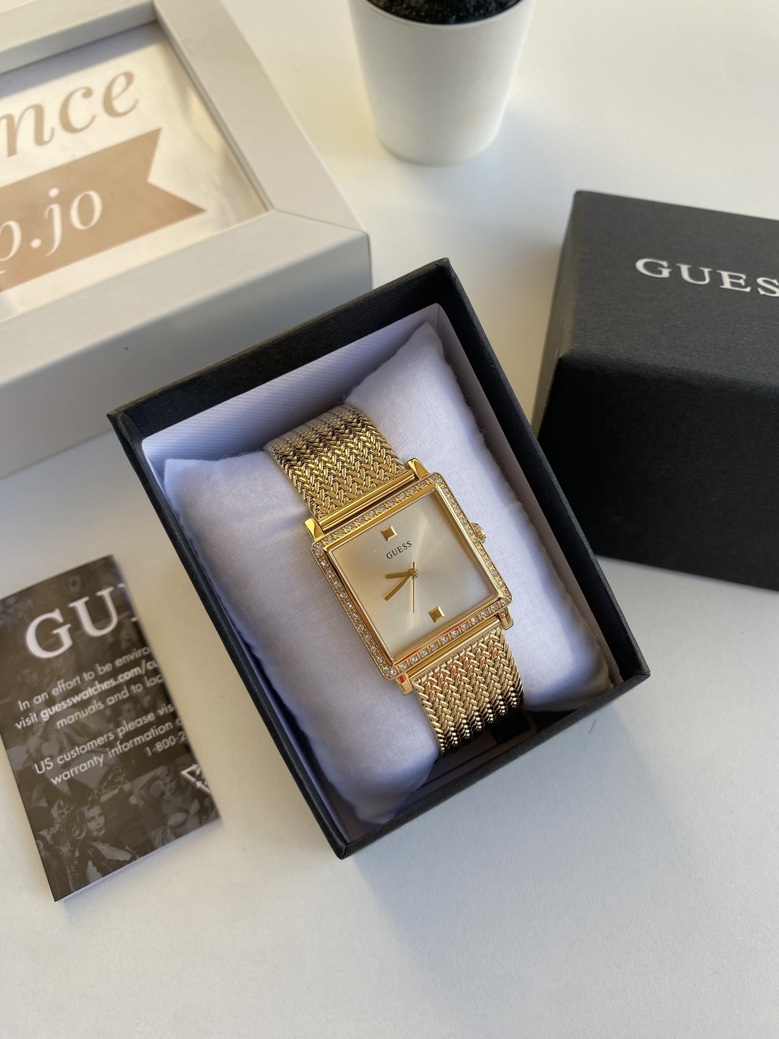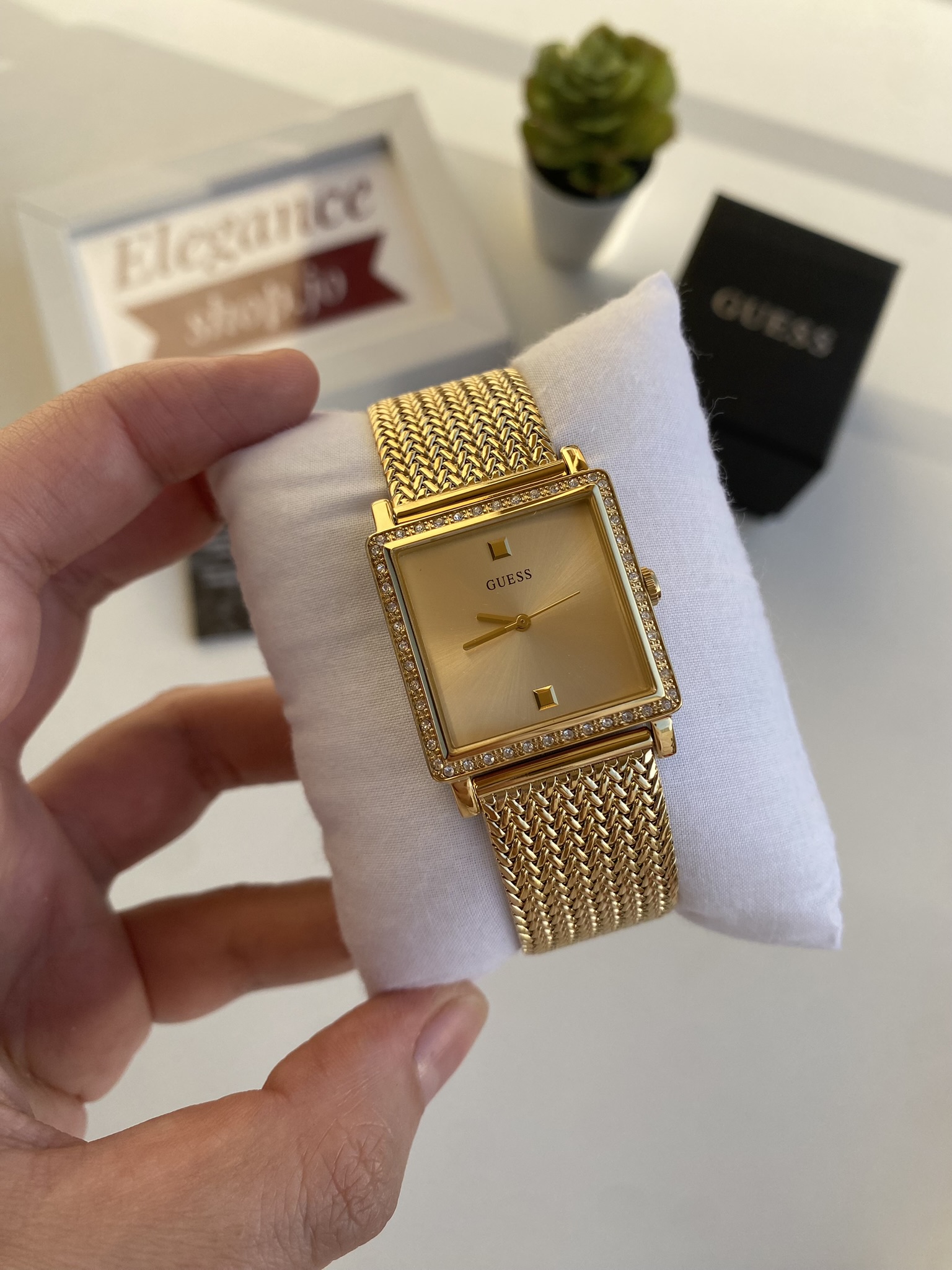 - Square bezel with rhinestone embellishments